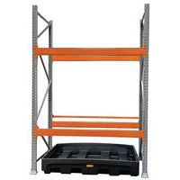 Robuuste stelling met opvangbak van gegalvaniseerd staal, ideaal voor opslagcontainers.