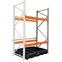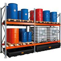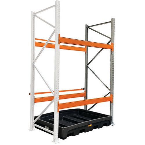 Robuuste stelling met opvangbak van gegalvaniseerd staal, ideaal voor opslagcontainers.