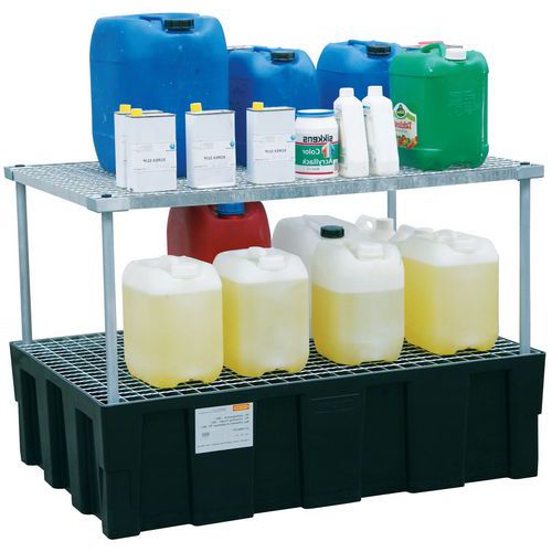 - Stelling die uitgerust is met een PE euro-opvangbak van gerecycled polyethyleen met rooster van gegalvaniseerd staal.