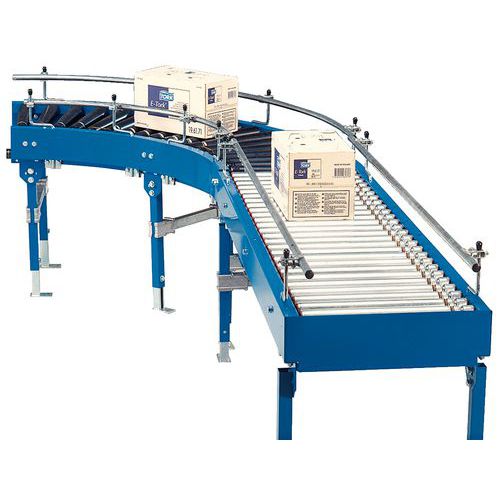 Gemotoriseerde rollenbaan met accu, RCLA, riemaangedreven, lengte 600 mm. Modulair circuit met rechte en gebogen delen. Rollenbaan met stevig frame. Afgewerkt met schokbestendige epoxylak. Absolute beveiliging van de last.