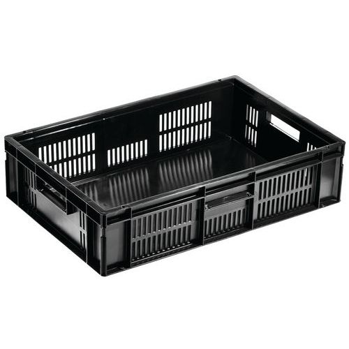 Euronorm 600x400 mm stapelbare bakken van geregenereerd materiaal zijn verkrijgbaar in verschillende hoogtes. De bakken hebben een vaste bodem met opengewerkte wanden of een opengewerkte bodem en opengewerkte wanden. Bovendien hebben alle bakken handgrepen met gaten aan de kleine zijkanten.