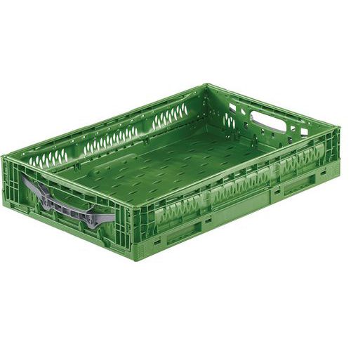 Praktisch vouwkrat, neemt weinig plaats in. Speciale constructie van bodem en hoeken, geschikt voor zware belasting in een stapel. Eenvoudig uit en in te klappen dankzij de ergonomische Lift-Lock-sluiting. Uitzonderlijk glad oppervlak om de goederen te beschermen. Optimale perforatie voor ventilatie van de te vervoeren producten. Stabiel en zeer eenvoudig te stapelen.