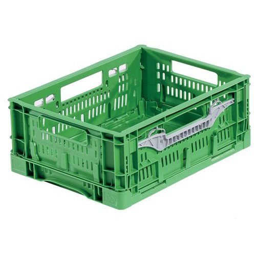 Praktisch vouwkrat, neemt weinig plaats in. Speciale constructie van bodem en hoeken, geschikt voor zware belasting in een stapel. Eenvoudig uit en in te klappen dankzij de ergonomische Lift-Lock-sluiting. Uitzonderlijk glad oppervlak om de goederen te beschermen. Optimale perforatie voor ventilatie van de te vervoeren producten. Stabiel en zeer eenvoudig te stapelen. Gemaakt in Duitsland Klantgarantie : 1 jaar