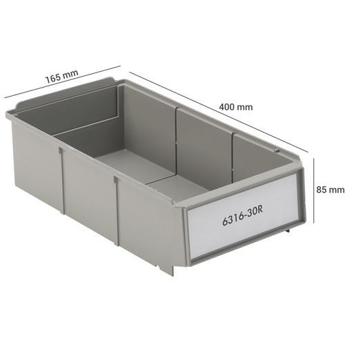 Bakken voor legplank, stapelbaar. De zelfklevende etiketten worden standaard geleverd. Dwarse transparante tussenschotten (gerecycled polystyreen). Kartonnen etiket met zelfklevende bescherming (S16) apart te bestellen, per 20 stuks.