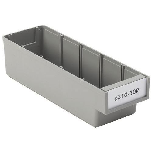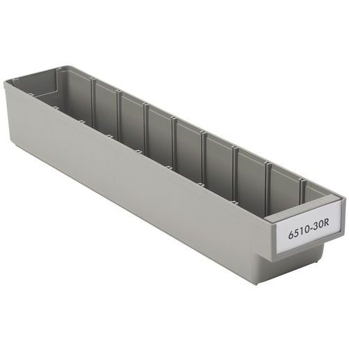 Bakken voor legplank. Passen eenvoudig in de standaard stellingsystemen. Drie diepten: 300 mm, 400 mm en 500 mm. Ook verkrijgbaar in stapelbare uitvoering. De bakken hebben rechte wanden. De kartonnen etiketten worden standaard geleverd. Dwarse transparante tussenschotten (gerecycled polystyreen).