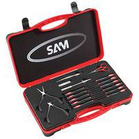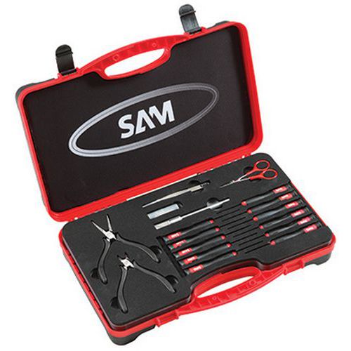 - Verstelbare moersleutel kort 6, klinkhamer met steel van grafiet, waterpomptang met vergrendeling, combinatietang bekleed18 cm, kniptang diagonaal bekleed 16, ultracompacte koffer met doppenset/bits, 2 drevels bekleed, 2 pendrijvers bekleed, koffer met doppenset 1/2 zeskant + S.161, combinatiesleutel OGV® 10 tot 24 mm, frame voor metaalzaag, combinatiesleutel OGV® 7 mm, 10 zaagbladen van twee metalen 8 tanden/cm, combinatiesleutel OGV® 8 mm, rolbandmaat 2 m/13 mm ABS, 6 schroevendraaiers Protwist® voor sleufschroeven en 3 kruisvormige schroevendraaiers Protwist®.