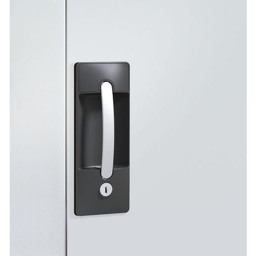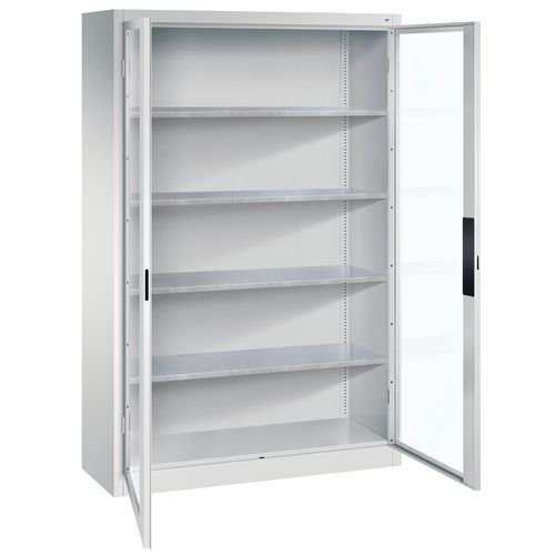 Stevige constructie van gelast staal. Deuren met glazen van acrylglas van 3 mm dikte. Openingshoek tot 180° dankzij externe scharnierpennen. Ingebouwde handgreep 'Ergo Lock', voorzien van een veiligheidsslot met 3 sloten, 2 sleutels meegeleverd. In 2 hoogtes: 1000 en 1950 mm. Gegalvaniseerde legborden, max. belasting 70 kg, verstelbaar in stappen van 15 mm. Epoxy thermocoating.