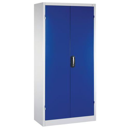 Draaideurkast van staal Serie 89, verstevigde deuren voor verhoogde stabiliteit, ophanging met scharnieren aan de buitenkant boven en onder met een ruime openingshoek van ca. 18 graden, samenvallende deuren voor gelijktijdige sluiting, gegoten handgreep Ergo-Lock (duwen om te sluiten), cilinderslot, 2 sleutels, 3-puntssluiting, Verzinkte legborden met een hoge draagcapaciteit van 11 kg, Verschillende mogelijkheden voor binneninrichting dankzij de verstelbare legborden in stappen van 15 mm Let op, veiligheidsadviezen: plaats het meubel op een vlak oppervlak, bevestig het aan de muur of een scheidingswand met geschikt bevestigingsmateriaal. Respecteer de aanbevolen maximale belasting en zorg voor een goede gewichtsverdeling. Gemaakt in Duitsland Max. belasting per legbord (kg) : 110 Max. belasting (kg) : 700