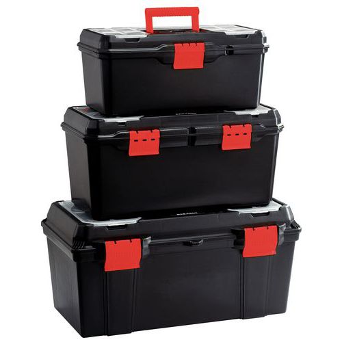 - Gereedschapskoffers van duurzaam kunststof met verwijderbare deksel. In het deksel bevindt zich een organizer voor kleine onderdelen. De koffer kan met een hangslot vergrendeld worden.