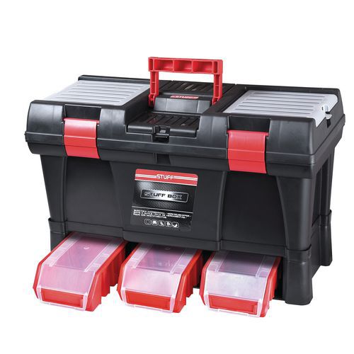 Gereedschapskoffers van duurzaam kunststof met verwijderbare deksel. In het deksel bevindt zich een organizer voor kleine onderdelen. De koffer kan met een hangslot vergrendeld worden.