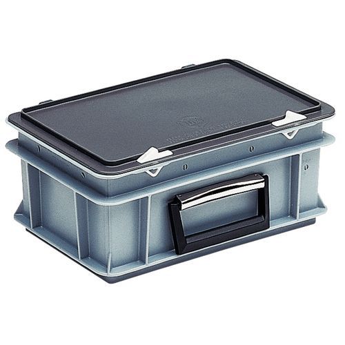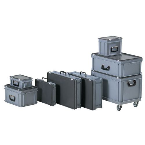 Gereedschapskoffer met klep en 2 versterkte scharnieren. Te vergrendelen met 2 kliksluitingen met veer. Stapelbaar, zonder risico van wegglijden. Perfect te onderhouden door de gladde wanden. Kunststof koffer met draagbeugel aan de lange zijde.