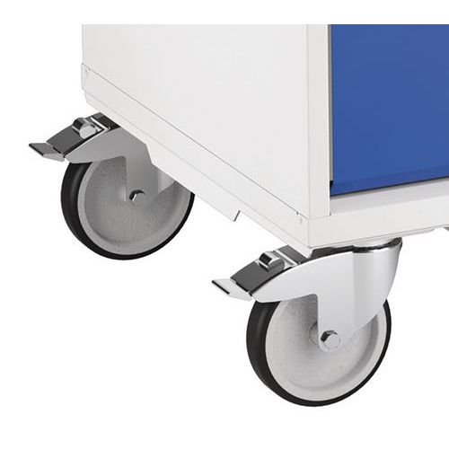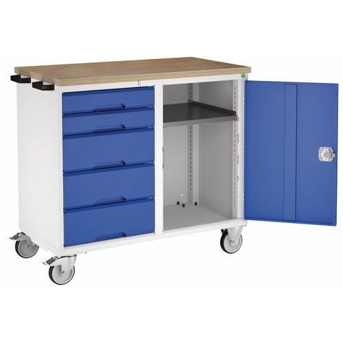 Robuuste verrijdbare en vergrendelbare werkbank met stevig werkblad van multiplex. Bewaar uw spullen op een veilige plaats in de afgesloten lades. Stabiel dankzij het afzondelijke blokkeersysteem van de lades, waarmee u slechts één lade tegelijk kunt openen. Voorzien van 4 rubberen wielen, waarvan 2 geremde zwenkwielen.