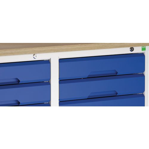 Robuuste verrijdbare en vergrendelbare werkbank met stevig werkblad van multiplex. Bewaar uw spullen op een veilige plaats in de afgesloten lades. Stabiel dankzij het afzondelijke blokkeersysteem van de lades, waarmee u slechts één lade tegelijk kunt openen. Voorzien van 4 rubberen wielen, waarvan 2 geremde zwenkwielen. Gemaakt in het UK Max. belasting (kg) : 300