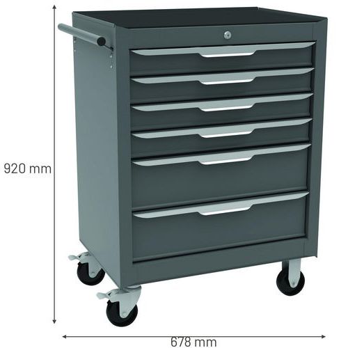 | Productnaam | Gereedschapswagen, Max. belasting: 300 kg, Max. belasting per lade: 30 kg, Totale hoogte: 920 mm |