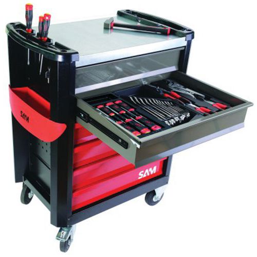 - Gereedschapswagen met 6 lades met 9 modules van foam en 80 gereedschappen. Optimaal gebruikscomfort met handgreep aan 1 van de 2 zijden. Grote veiligheid met centraal slot met sleutel. Stabiliteit: geoptimaliseerde wielen, 2 bokwielen en 2 zwenkwielen met rem.