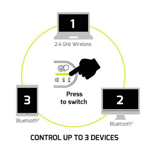 Geruisloos klikken voor een rustige werkomgeving. 6 knoppen, waaronder een knop voor het kiezen van de draadloze verbinding. Optimalisering van de batterij dankzij de stand-bystand en de toets ON/OFF.