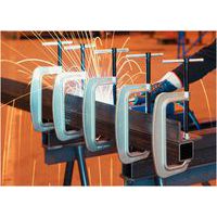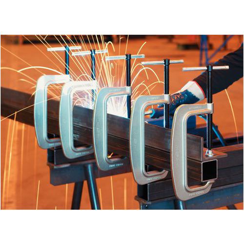 Vaste, geribbelde klemvoet voor een perfecte grip. Klem in C-vorm beveiligd door een mobiel kogelgewricht met schroef. Verzinkt om roest tegen te gaan. Schroefkop uit één stuk, voor optimale stabiliteit van het gereedschap. Sluiting van de schroef op 0 voor een maximale klemkracht.