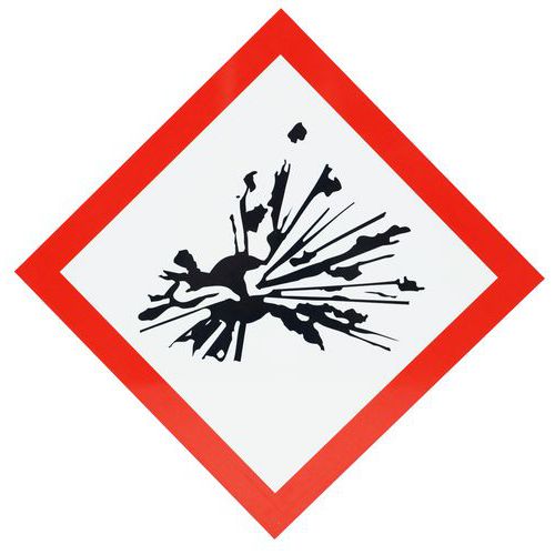- Bord met pictogram explosieve stoffen om de aanwezigheid aan te geven van producten die kunnen exploderen bij blootstelling aan vuur, statische elektriciteit of stoten.