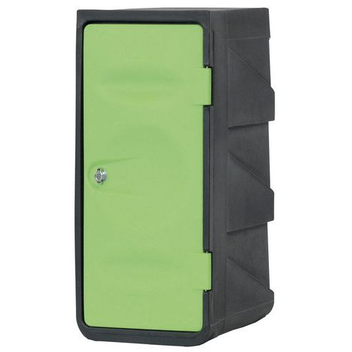 Constructie en deuren van ultrasterk recyclebaar polyethyleen. UV-bescherming. Uit één stuk voor een nog hogere weerstand. Model op sokkel of voet. Deursluiting met hangslothouder (hangslot niet meegeleverd). Geen interieuruitrusting. Gemonteerd geleverd.