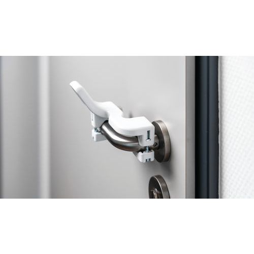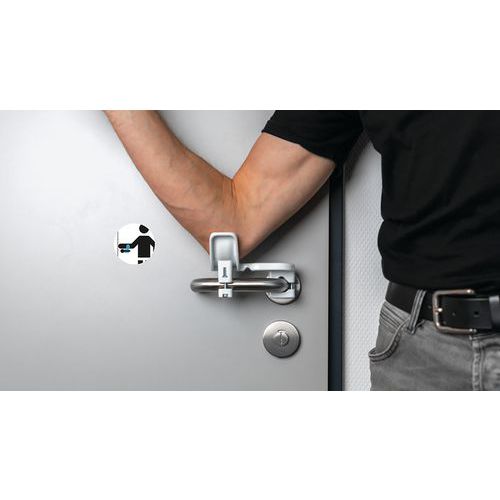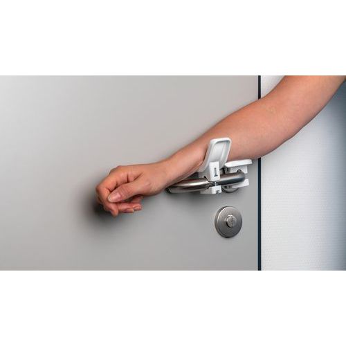Let op: niet aanbrengen op branddeuren (normen DIN 18273 en EN 1634) en nooduitgangen (normen EN 179 en EN 16034). Materiaal Brandwerend ABS, voldoet aan de normen voor openbare gebouwen (conform norm DIN 4102-1), bestand tegen onderhouds- en ontsmettingsmiddelen, geen risico op beschadiging. Te bevestigen op bestaande handgrepen, zonder risico op beschadiging.