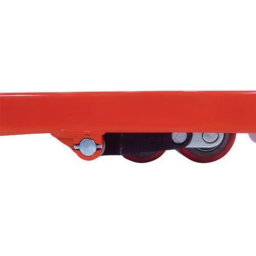 Voorzien van stuurwielen en wielen op de dubbele vork van polyurethaan.