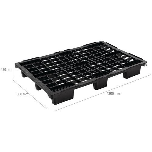 Geleverd met 30 lichte, ergonomische en nestbare pallets van 1200x800 mm, gemaakt van gerecycled niet-poreus materiaal.