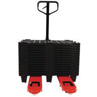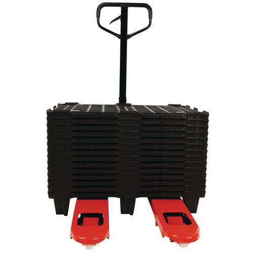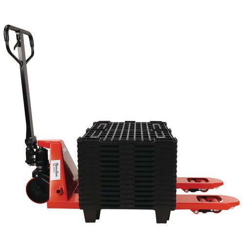 Handpalletwagen, hefvermogen 2500 kg, vorklengte 1150 mm. Comfortabele dissel met rubberen coating en chassis van zeer sterk staal. Versmalde uiteinden van de vork en dubbele wielen om makkelijk over onregelmatig terrein te rijden. Geleverd met 15 nestbare lichte pallets met 6 blokken, van gerecycled HDPE 800 x 600 x 130 mm. Pallets met maximale statische belasting van 700 kg, maximale dynamische belasting van 350 kg Hendel met 3 standen: heffen, neutraalstand en neerlaten.