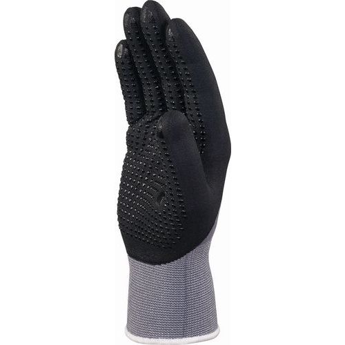 Polyamide/Spandex. Nitril/polyurethaan coating op de handpalm, vingertoppen en halve rug van de hand. Nitrilnoppen op de handpalm. Jauge 15.