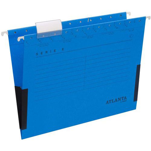 Sterke en duurzame, universele hangmap voor alle toepassingen. Voor papierformaat A4, met zwarte opdruk en beige linnen soufflets. Glasheldere, 60 mm brede Vario ruiters. Gemaakt van 230 g/m² recycling karton. Hoofdzakelijk gebruikt in Duitsland. Spoorbreedte A4: 330 mm.