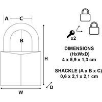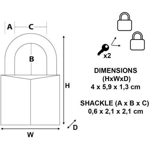 | Productnaam | Hangslot 40 mm, Lengte: 32 mm, Aantal sleutels: 2, Beugel Ø: 6 mm, Productgewicht: 0.12 kg, Dikte: 16 mm |