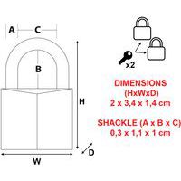 | Productnaam | Hangslot, Kleur: Zwart, Aantal sleutels: 2, Beugel Ø: 3 mm, Hoogte: 1.1 cm, Aantal pinnetjes: 3 |