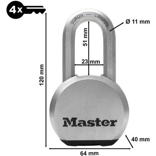 | Productnaam | Hangslot massief Staal, Lengte: 56 mm, Aantal sleutels: 4, Beugel Ø: 11 mm, Productgewicht: 0.686 kg |