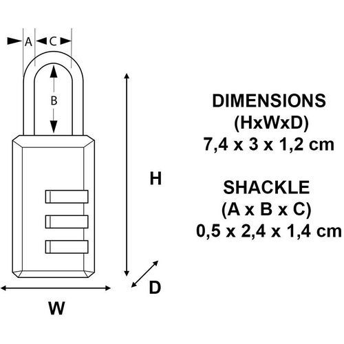 | Productnaam | Hangslot met 3-cijferige combinatie, Beugel Ø: 5 mm, Aantal draaischijven: 3, Lengte: 74 mm, Hoogte: 2.9 cm |