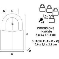 | Productnaam | Hangslot set aluminium 40 mm, Lengte: 32 mm, Aantal sleutels: 4, Beugel Ø: 6 mm, Hoogte: 21 mm |