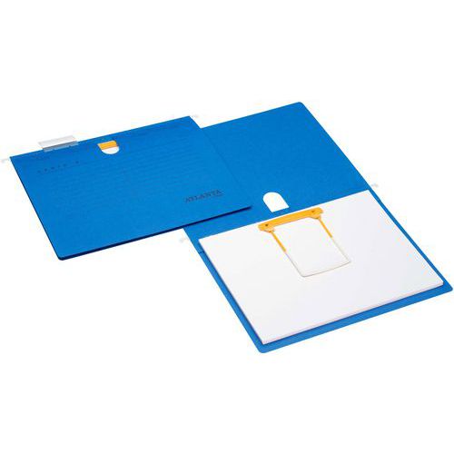 Voor papierformaat A4, met zwarte organisatieopdruk. De hangsnelhechter is gemaakt van 230 g/m² recycling karton. Het is voorzien van een metalen hangijzer met wit gepoedercoate uiteinden, met een spoorbreedte van 330 mm. Verkrijgbaar in de kleuren rood, geel, groen, blauw en bruin.