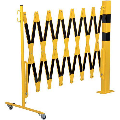 Uittrekbaar stalen hek op wielen en vierkante paal voor tijdelijke afbakening. Tweekleurige strepen voor betere zichtbaarheid. Alleen geschikt voor binnengebruik. Eenvoudig te hanteren, op te bergen en te gebruiken dankzij de wielen met rem. TÜV-certificaat. Plaat 120 x 195 mm.