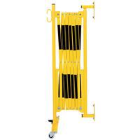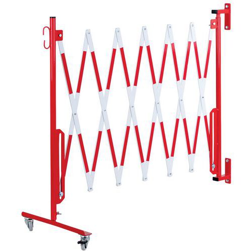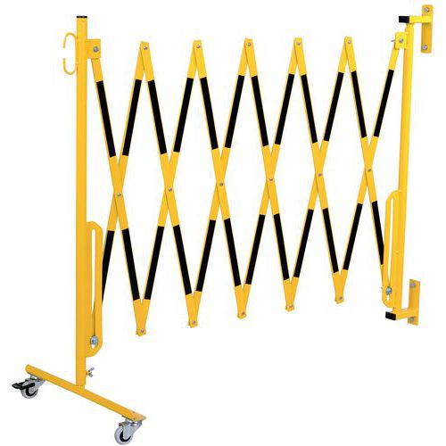 Uittrekbaar stalen hek op wielen en muurbevestiging voor tijdelijke afbakening. Tweekleurige strepen voor betere zichtbaarheid. Alleen geschikt voor binnengebruik. Eenvoudig te hanteren, op te bergen en te gebruiken dankzij de wielen met rem. TÜV-certificaat.