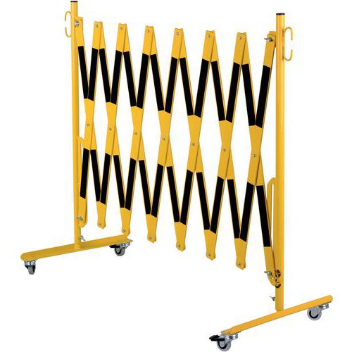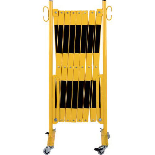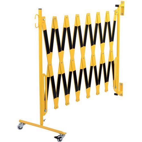 Uittrekbaar stalen hek op wielen en muurbevestiging voor tijdelijke afbakening. Tweekleurige strepen voor betere zichtbaarheid. Alleen geschikt voor binnengebruik. Eenvoudig te hanteren, op te bergen en te gebruiken dankzij de wielen met rem. TÜV-certificaat.