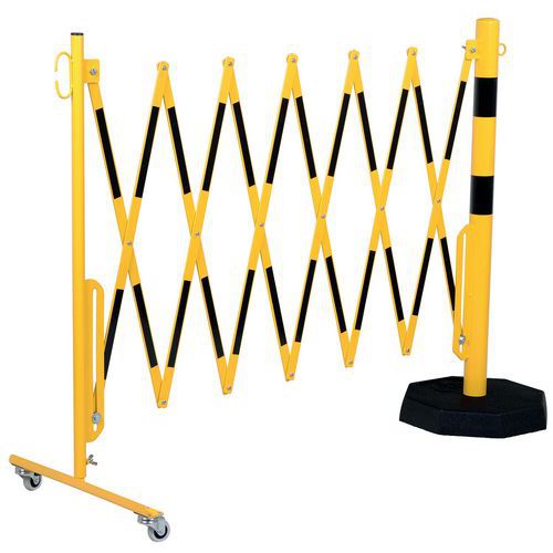 Uittrekbaar veiligheidshek op wielen met aan de ene kant remmen en aan de andere kant een beschermpaal. Hiermee kunt u tijdelijk een verboden gebied afbakenen. De paal maakt een stabiele plaatsing van barrières mogelijk op plaatsen waar muurbevestiging niet mogelijk is. Paal met zware sokkel van 8 kg. TÜV-certificaat.