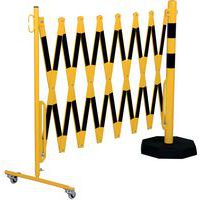 Uittrekbaar veiligheidshek op wielen met aan de ene kant remmen en aan de andere kant een beschermpaal. Hiermee kunt u tijdelijk een verboden gebied afbakenen. De paal maakt een stabiele plaatsing van barrières mogelijk op plaatsen waar muurbevestiging niet mogelijk is. Paal met zware sokkel van 8 kg. TÜV-certificaat.