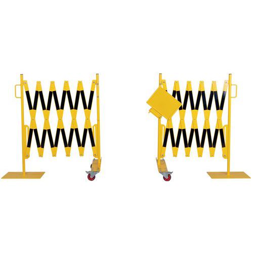 Set uitbreidbare barrières om de toegang tot grote oppervlakken tijdelijk te blokkeren en te beveiligen. Het centrale bevestigingselement maakt het mogelijk om de 2 barrières aan elkaar te koppelen, maar ook om een informatienota in A4-formaat weer te geven. Stevig en stabiel: hekken op wielen met remmen voor eenvoudig en veilig gebruik. Met poedercoating. TÜV-certificaat. Eenvoudig te hanteren dankzij de polsen.