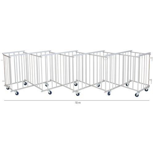 Uitbreidbaar hek, zelfdragend en robuust. Bestand tegen hoge druk: geschikt voor ieder evenement waarbij publiek aanwezig is (sport- of culturele evenementen, concerten, festivals, stadions, attractieparken, enzovoort). Eenvoudig te gebruiken en op te bergen: eenvoudig en snel te plaatsen. Vouwt zich uit met wielen en staat binnen 5 seconden. Wielblokkering: door te drukken op de rem. As en schroefwerk van rvs: bestand tegen alle weersomstandigheden zonder te roesten. De wielen zijn gemaakt van: blauw rubber, met klemmen van verzinkt staal, gehard en zwenkbaar.