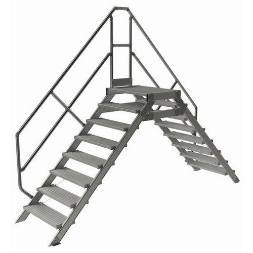 Vaste loopbrug met een hoek van 45° met leuningen. Standaard met 1 leuning die links of rechts kan worden geplaatst. Zeer stabiele loopbrug: de treden zijn aan de lijsten geschroefd. Bevestiging van de loopbrug op de grond met winkelhaken. Platform met leuning aan 1 van de zijden. Product gefabriceerd in Frankrijk. Gemaakt in de EU Max. belasting (kg) : 200 Klantgarantie : 10 jaar