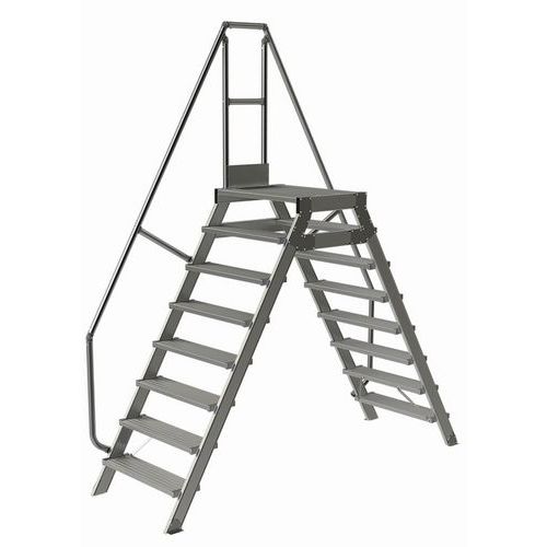 Vaste loopbrug met een hoek van 60° met leuningen. Standaard met 1 leuning die links of rechts kan worden geplaatst. Zeer stabiele loopbrug: de treden zijn aan de lijsten geschroefd. Bevestiging van de loopbrug op de grond met winkelhaken. Platform met leuning aan 1 van de zijden. Product gefabriceerd in Frankrijk. Gemaakt in de EU Max. belasting (kg) : 200 Klantgarantie : 10 jaar