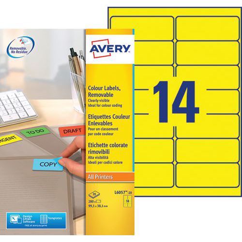 Herplaatsbaar kleurenetiket Avery, Aantal etiketten/vel: 14, Aantal etiketten: 280, Lengte etiket: 99.1 mm Herplaatsbaar kleurenetiket Avery, Aantal etiketten/vel: 14, Aantal etiketten: 280, Lengte etiket: 99.1 mm