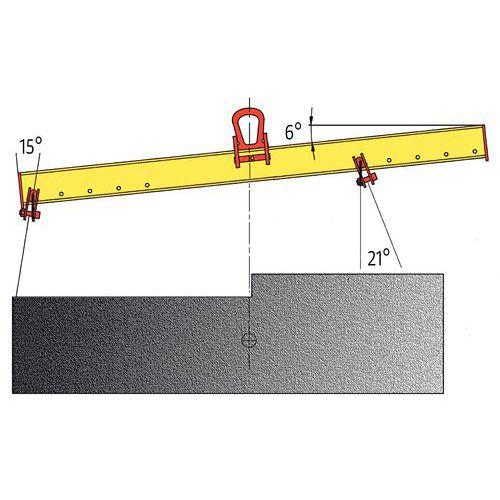 Hijsbalk, voorzien van 2 verstelbare balkklemmen, die het mogelijk maakt om in verschillende situaties uiteenlopende lasten te heffen. De balkklemmen zijn instelbaar in stappen van 100 mm. Bovenste ophanging met centrale ring. Zeer eenvoudig en betrouwbaar instelsysteem. Vervaardigd uit ultrasterk staal.