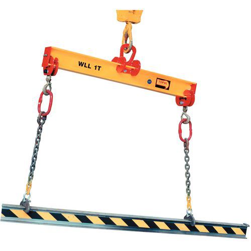 Hijsbalk, voorzien van 2 verstelbare balkklemmen, die het mogelijk maakt om in verschillende situaties uiteenlopende lasten te heffen. De balkklemmen zijn instelbaar in stappen van 100 mm. Bovenste ophanging met centrale ring. Zeer eenvoudig en betrouwbaar instelsysteem. Vervaardigd uit ultrasterk staal.