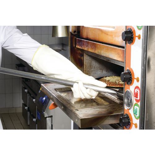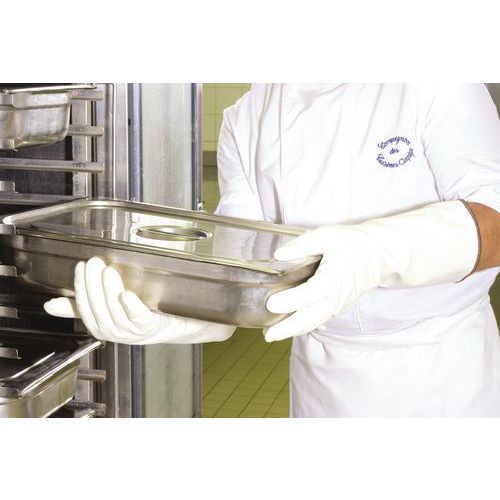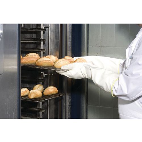 Geschikt voor contact met voedingsmiddelen voor alle soorten voedingsmiddelen. Thermische bescherming tot 250 ºC* (*vanaf 150 ºC kan het product stugger worden en van kleur veranderen, maar de prestaties worden niet aangetast). Lange manchet voor het hanteren van hete gerechten. Bestand tegen oliën, vetten en schoonmaakproducten. Kleuren komen overeen met kledingnormen voor de horeca. Wasbaar voor meer hygiëne.