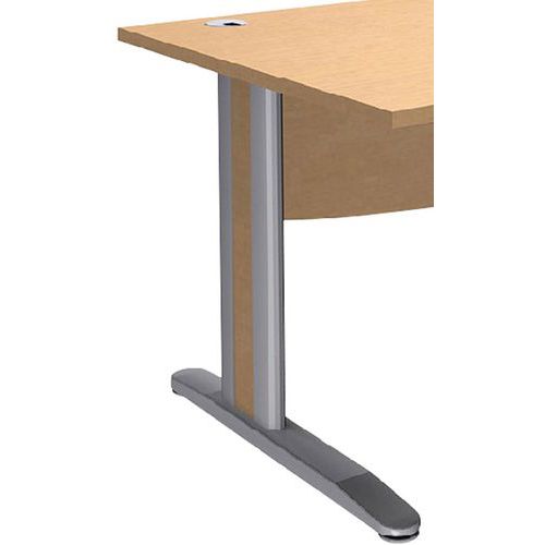 Bureau met L-onderstel Quatuor met retour rechts of links Blad van spaanplaat, hoogte 72 cm. Metalen poten in L-vorm met kabeldoorgang onder afneembare houten latjes. Onderstel met stelpoten. Retour van blad diepte 110 cm (120 cm totaal) aan te vullen met 1 verstevigingspoot of 1 ladeblok op bureauhoogte. Totale L/B/D blad: 200 x 120 x 60 cm. Monteerklaar geleverd met handleiding