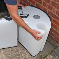 Sluit de Multi-Hub-pod aan op het uiteinde van een gemonteerde overstromingsbarrière en draai de pod nokvormig in het object in situ, meestal een muur, om een effectieve barrière te creëren.